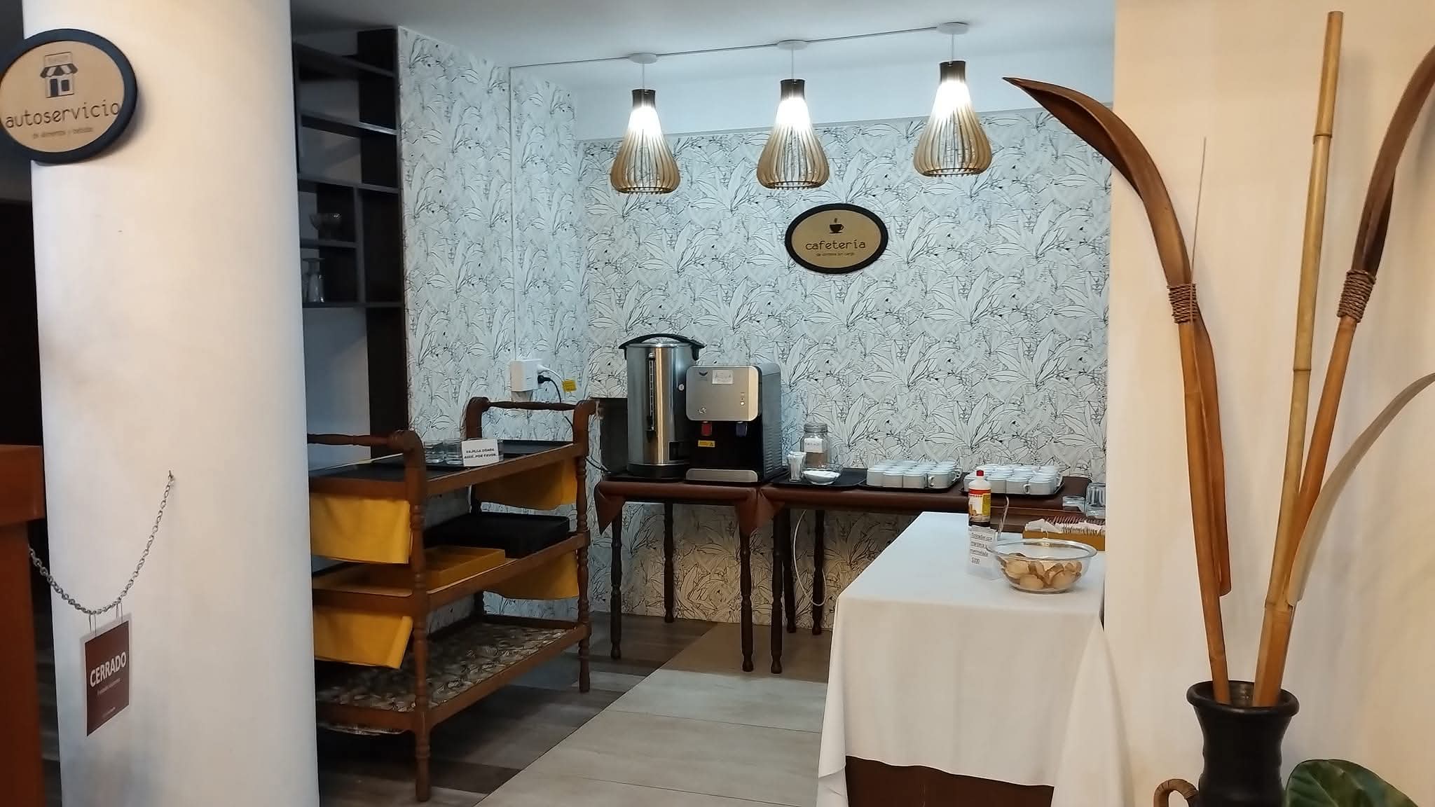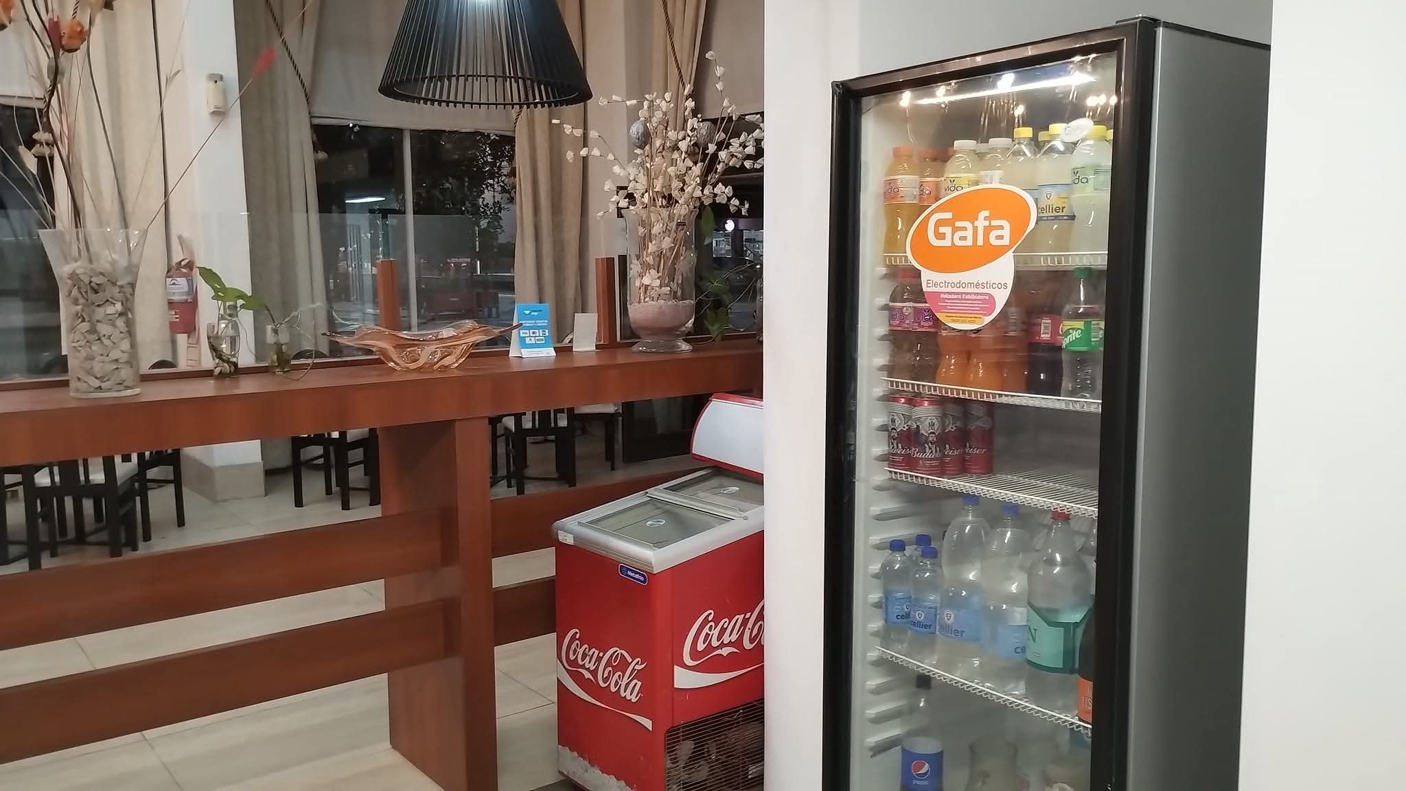 WiFi, café, agua caliente, jugo de naranja, sector de mesas con cubiertos, platos y microondas donde podrás consumir tus propios alimentos o el delivery que elijas.